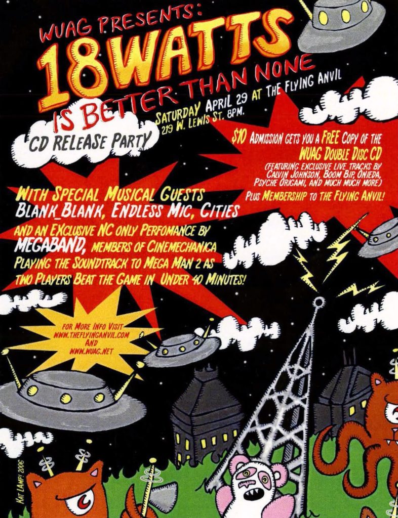 Interference with stations in Raleigh and Salisbury had necessitated another frequency shift, this time to 103.1 MHz. In 1994, the station also began publishing the Dead City Radio zine, profiling alternative musicians like Polvo and Superchunk. By the late 1990s, WUAG was online with a streaming audio signal that could be heard worldwide and was also sponsoring local music events and releasing local music compilations on CD.