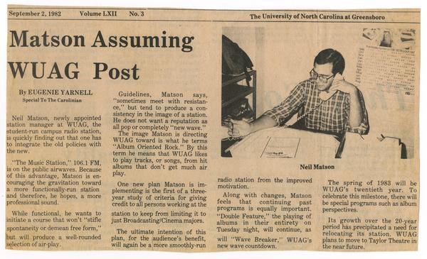The University handed control of the initial FM frequency to students and WUAG became UNCG’s student-run radio station in September 1973. The station emphasized contemporary rock, jazz, and folk music with the musical format being described as “progressive rock.” The first general manager of this new station was Gary Kofinas, an undergraduate student from Charlotte, North Carolina.